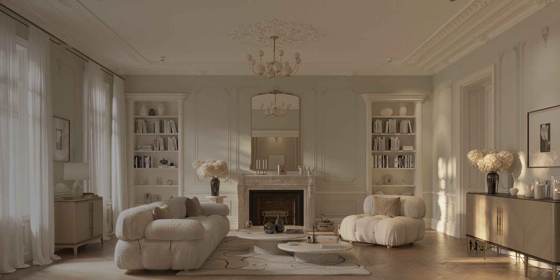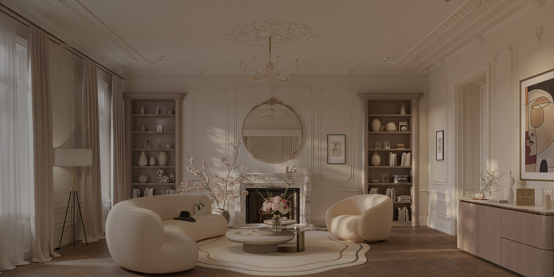 tones compose a space of light, airy sophistication.